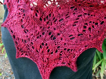 This beautiful intricate shawlette is worked from the top down and has a traditional triangle shape but no center spine. It is first shawlette in a series of seven, the Seven Songs. This one is named for a beautiful piano piece by Claude Debussy, "La Puerta del Vino" because of it's gorgeous wine colored yarn in the beautiful Bugga base by the Sanguine Gryphon.