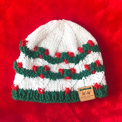 So this hat was an accident but I think it’s a pretty cute accident! Last summer we were trying to make an ocean waves hat...well, that hat is still in the works, but the first “waves” pattern I used looked so much like Christmas garland that I decided it just had to join our At The North Pole Collection. So here’s our deck the halls hat with Christmas garland and holly berries!