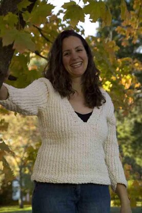 This deep V-neck sweater is perfect to ward off chills at spring and fall festivals. A quick knit, with slip stitch vertial lines and a double seed stitch edging, you'll find it creates slimming lines. Designed with a double strand of organic cotton in mind, this can also be transformed into winter wear in wool.