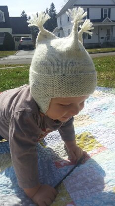 This super cute hat is knit from the bottom up. A fairly quick knit with a unique construction: it is begun flat, and then joined & knit in the round. This creates a longer back, which keeps the back of the baby’s neck covered and warm. The under-the-chin strap will keep the hat secured on the baby's head, minimizing the risk of the hat being removed & tossed aside by the little duffer!