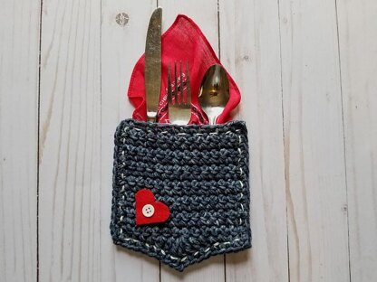 The heart detail at the base of the pocket is made with red felt and a button is added for more country charm. There is very minor sewing involved unless you really don’t want to sew, in which case you can hot glue almost everything. It makes quick work of the entire project. The only part that cannot be glued is the tan colored stitching around the perimeter of the pocket, but this is achieved with a tapestry needle and size 10 crochet thread.
