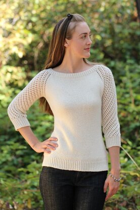 Deodara is a simple top down raglan pullover with 3/4 length lace sleeves wonderfully suited for the transition from warm summer days to cooler autumn weather. The body is a breeze to knit and the sleeves are worked in the round on the bias in an easy lace pattern. Included in the pattern are both the original version and an alternative mirrored sleeve version.