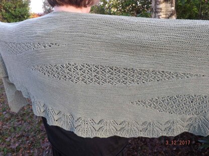 The shawl is knitted in one piece starting at the bottom lace edge. This shawl can be knit in one color, two colors or several colors.
