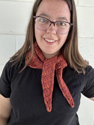 • Pattern is written in US crochet terms. • Yarn: DK weight (#3), approximately 225 yards. I used Mary Gavan Yarns “Hoodoo DK,” 100% merino wool, in the color “Sedona Sunset.” • Hook: 4 mm, or size needed to meet gauge. • Finished size: Before blocking, approximately 36” long by 8.5” deep. • Gauge: Before blocking - first 9 rows should measure approximately 2” wide and 4” long.