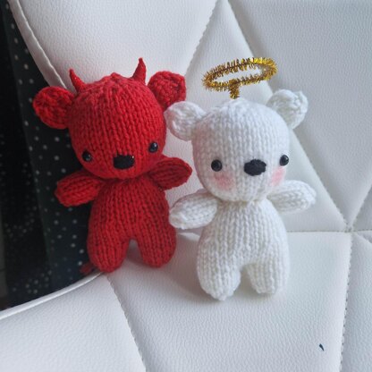 A cute and easy-to-follow pattern for a pair of Devil and Angel Mini bears that can adorn your shelf or be a great decor piece. I use double-knit acrylic wool. Size 10 needles, and this toy measures approx 4 Inches tall