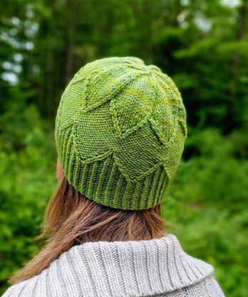 The Diadem Hat features a twisted rib brim which flows into a twisted stitch zigzag / diamond motif. Directions are provided for both fitted (green hat) and slightly slouchy (light blue hat) versions.