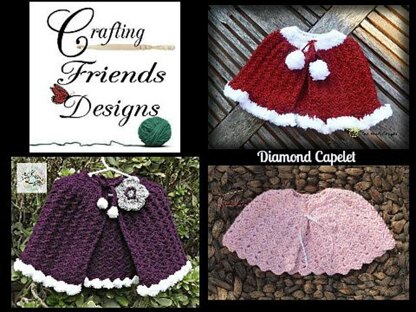 A fun and quick pattern for a beautiful cape. The Diamond Capelet pattern includes directions for 2 versions and sizes Doll - Childs 14.