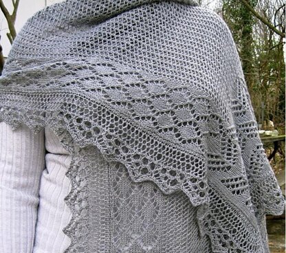 This is a listing for a knit wrap pattern that features a four distinct lace stitches, none of which is difficult. If you've never made a shawl or wrap in the Shetland manner, this may be a good one to start with, as it is not at all difficult. However, the final product gives the look of having been made by an expert. The center section features three lace stitches, and the border is knitted on, making a seamless wrap. Skill Level: Beginner + - Intermediate (assuming a basic knowledge of lace knitting). The pattern for all the stitches are both charted and written out line by line.