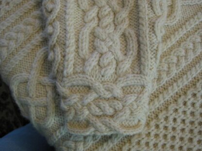 This is a saddle shoulder Aran sweater which features a cable detail around the hem, cuffs and collars instead of the traditional ribbing. The sweater was designed as my level 3 project for the TKGA Master Knitter program.