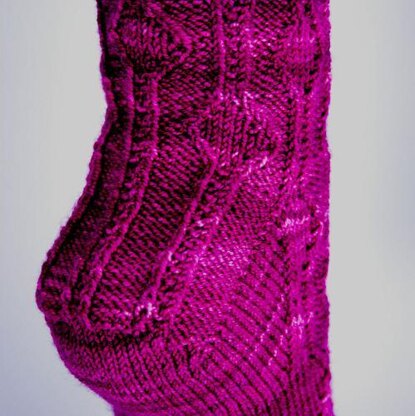 A top-down sock pattern featuring a gusset and patterned heel flap.