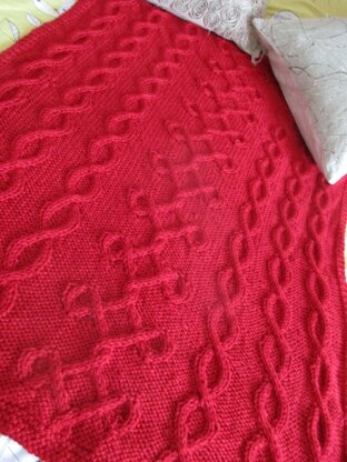 This is a pattern for a diamond twist cable throw, originally published in Knitting magazine. It is knitted in a chunky yarn, with a diamond twist cable at the centre and chain cables either side, with a garter stitch border.