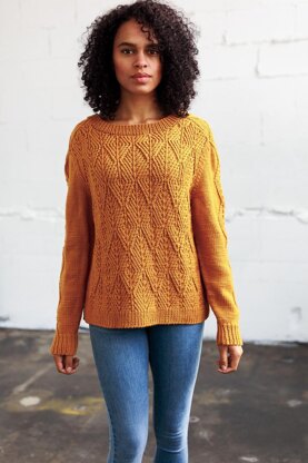 The pullover is worked bottom up in pieces, with an inclusive range of eleven sizes that takes into account the proportions of the twisted stitch diamond motif. Saddle shoulders ensure a perfect structure and flattering fit. Notes for simple modifications are included. Cable patterns are both written and charted.