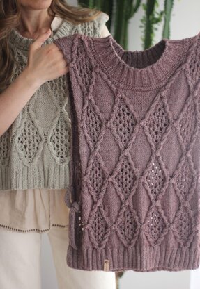 Sleeveless split-side vest featuring a geometric diamond pattern with its interplay of solid and lacy spaces. Lovely for layering over just about anything from easy breezy tops and bottoms to a fitted tanks.