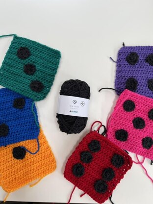This Dice/ Cube is made using Worsted weight yarn from Hobbii, and took 1 ball of black, then 25g of 6 other colours.