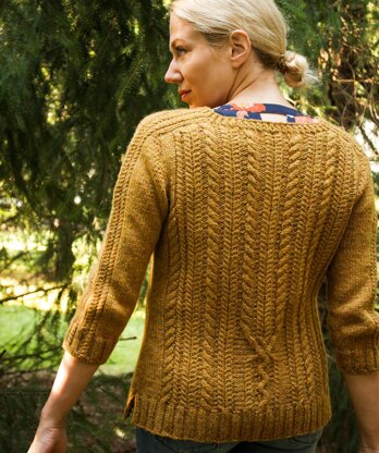 I love to knit cables but haven’t designed heavily with them in the past—something about creating multiple charts for various sizes takes a bit of the joy out of all those cable crosses! This sweater, though, just demanded to be brought to life, charts and all. It is inspired by photos of one of my favorite actors, Diego Luna, blessing us with his perfect smile while relaxing in a cozy cabled pullover. Though the basic cables are similar, once it was on the needles, this sweater became something else entirely—a cardigan, most obviously, with saddle shoulders, ¾ length sleeves, moderate waist shaping, and a traveling motif on the back that makes it stand out from traditional Aran sweaters. Diego is worked in Julie Asselin’s Nurtured, a quintessential autumn yarn with squish, structure and softly heathered hues. Rhinebeck sweater? I think so! Note: This pattern is charted only.