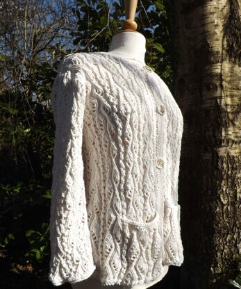 The pattern is written for a knitter who is able to work in the round as well as back and forth, follow lace charts as well as written instructions; and knows how to pick up stitches and make increases, decreases and button holes.(directions is a combination of chart and written text).