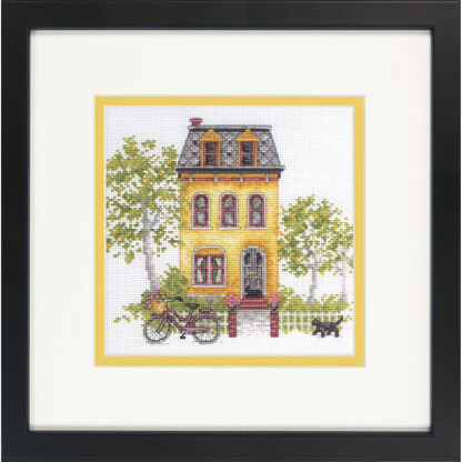 Counted cross stitch kit. Kit includes pre-sorted, stranded cotton thread; count, colour, cotton aida; needle, large-square charted design; front sheet picture and instructions in 8 languages (EN, NL, FR, GER, IT, SP, RU, SW). 6 x 6in. Design © Lisa Audit. Licensed by Roaring Brook Art. Skill level: Intermediate. Gentle hand wash after stitching. Dry flat. This peaceful neighborhood sure looks inviting! Even the cats are happy to hang out in front of the charming yellow house on this cross-stitch design from Dimensions.
