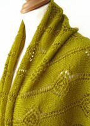 This shawl is triangular shaped but generously sized with vertical lines of a teardrop shaped lace motif travelling down its length. Although the pattern is worked in rows the cast off width of 120cm (47 1/2 in) means you'll need to work on a circular needle.
