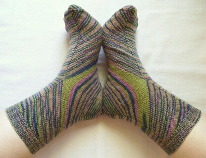 Description from website: Another sock construction experiment, these begin at the heel with a small square and are increased outward before splitting in two for the foot and the leg. The varying stitch-counts create an interesting effect with variegated yarns.