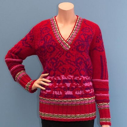 After making the Flower-cardigan pattern I made the Flower pull. The colors are based on the Flower Hmong minority tribes of Vietnam, I love the use of the colors in folklore clothing. Feel free to change them to others