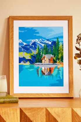 Toile à broder Pénélope 10 fils au point de croix avec un magnifique motif des Alpes. Brodez cette toile pré-imprimée avec la laine ou le fil de tapisserie de votre choix en demi-point de croix.