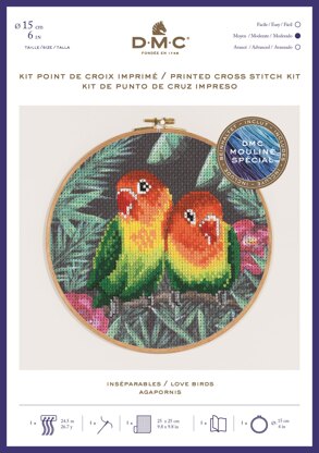 Déployez vos ailes avec ce kit de broderie de chez DMC mettant en vedette une touchante paire d'inséparables. Le kit vient avec un cercle à broder en bois de 15cm (6”) prêt à accrocher ainsi que de la toile aida imprimée, des fils, des diagrammes, des instructions et une aiguille. C'est un excellent cadeau – même pour soi-même !