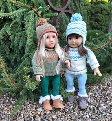 Adorable round yoke style pullover style sweater pattern for most 18 inch dolls. Adorable matching ear flap beanie. Stranded color work in simple fair isle patterns at yoke, hem and sleeve cuffs. Familiar stitches are used, and set can be completed in a few evenings for your favorite little girl to play with!