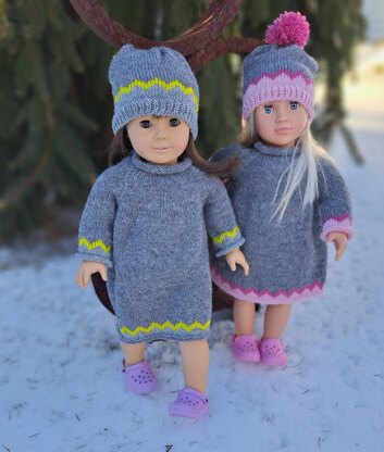 Adorable two piece set for most 18 inch dolls. Sweet little matching beanie with pom pom. Familiar stitches are used, and set can be completed in a few evenings for your favorite little child to play with!