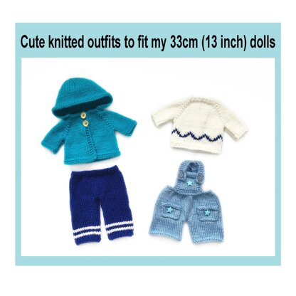 Knitted dolls clothes pattern to fit my 33cm (13 inch) dolls which are all listed on Lovecrafts and Etsy. The pattern is for the dolls clothes only and includes a hoodie, pants, sweater and shorts. The patterns are knit flat and seamed and are very easy to follow with clear instructions and photos.
