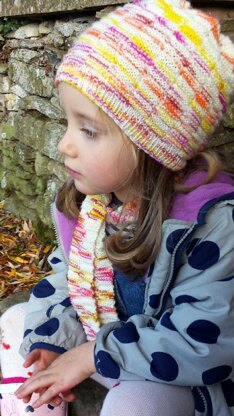 This pattern uses 4ply sock yarn to create a light but cosy hat and scarf set for children. The knit/purl pattern used creates a concertina effect with little air pockets to add extra insulation without bulk- hence the high row count on the gauge. The sample shows off the pooling of a variegated, artisan dyed yarn but the pattern would work equally well with a solid or semi-solid example.