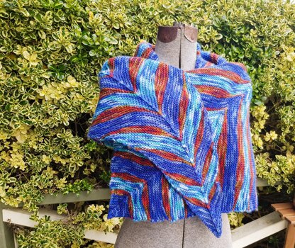 Dolmades Shawl Knitting pattern features a distinctive modern graphic leaf design in contrasting garter stitch stripes.