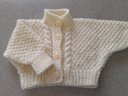 Baby cardigan with dolman sleeves in double moss stitch with cable detail on front. Age 0-3 months, 14-16" chest.