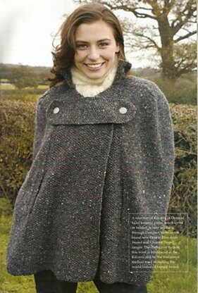 Popular Aran weight cape with separate buttoned trim and "pocket" slits. The shaped panels are knitted flat, sewn together and the collar then attached.