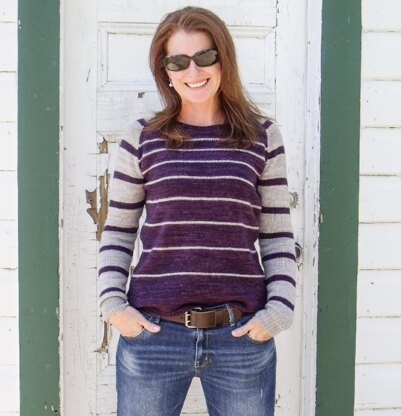 Donna is a fun little pullover with different stripes on the body and the sleeves and a rounded bottom hem. Worked top-down, it is knit flat in one piece to the underarm, then the piece is joined in the round for the body and the sleeves. Only one little seam result!