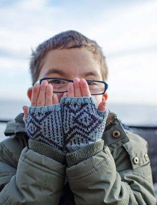 The geometrical pattern for these gloves was inspired by some daft doodling my kids used to do to decorate their hands. The lice-stitch technique used here sprinkles single stitches of contrast color across the background, and is a clever way of carrying your contrasting yarn through the long stretches while working large, non-repeating motifs of colorwork.