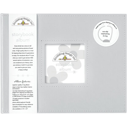 DOODLEBUG-Storybook Album. This package contains one 3-ring album with a 3-1/2x3-1/2in photo window on the front cover and 12 page protectors (eleven 8x8 inch pockets and one photo-recipe card protector with 3 pockets of various sizes). Albums are available in a variety of designs. Albums measure 8-3/4x11x2-1/2 inches. Imported.