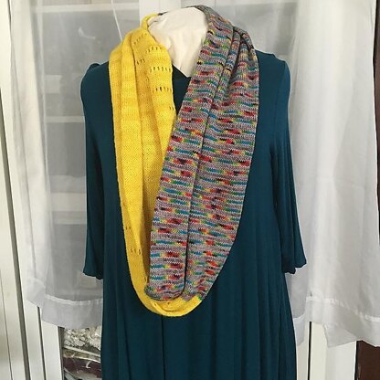 Get that beautiful striping sock yarn out of your shoes and wear it for the world to see! This versatile loop scarf can be worn doubled for warmth or in a single loop as a fashion piece.