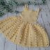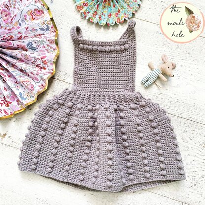 Pattern Description The Dottie Dress is so much fun to make and so easy too. It starts with a single crochet ribbing waistband. The ribbing needs to have a negative ease of up to 15cm/6in. This is so that the waistband fits snugly around the waist and does not fall off. Once the waistband is complete, you will make the skirt. There are two increase rows that coincide with the puff row. Next, the front panel is stitched back and forth across the top of the waistband ribbing. Two straps are stitched with 4 button holes at the end of each strap. This ensures that the dress will grow with your little one and will hopefully fit longer! Two buttons are secured to the inside of the waistband for each strap. The straps can be worn crossed in the back. Lastly, there are button holes and a button added to the back of the waistband for ease of getting in and out of the dress. Wear it with a collared blouse or a t-shirt in the summer! Make sure to make the matching Dottie bonnet!