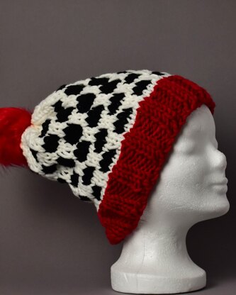 This fun dotty beanie hat (shown here in a Cruella Deville inspired colour scheme) is much easier to knit than it may appear.