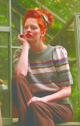 This vintage inspired sweater looks nostalgically at post-war fashions. It uses eight wonderful Jameson and Smith colours which stripe across in delicate design.The puff shoulder and ribbed waist create a flattering silhouette. Easy to knit this is a good project for anyone venturing into colour work. For further yarn details please see link.