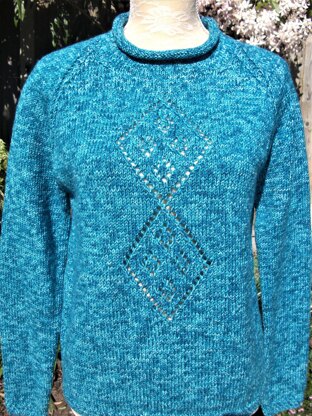 A pretty raglan sweater that features two eyelet motif diamonds on the front. The flattering neckline incorporates a small rouleau so it sits just away from the neck.