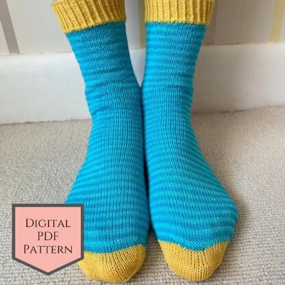 The socks are knit from the top-down and uses heel flap construction. The Helical knitting method is also used to create the stripes in these socks.