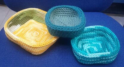 This is a pattern that can be used to make a no-sew double-walled sturdy square-ish bowl (or pot, if it’s taller than it is wide) of just about any size you like. You work the outer base, turn for the outer wall, turn twice for the top edge, then work what will be the inner wall and finally the inner base, then actually push the inside into the bowl and it will stay in place – although you COULD put a stitch in there if you want to do that. It looks quite good if you change colours for the base and sides and/or the inside and outsides. It’s really easy, too, and self-supporting. You can also use it to make the biggest possible bowl using up whatever leftover yarn you have from your previous projects, which I find very useful to avoid waste! I’ll tell you how to work out how to decide how big you can go before you start working the inside.