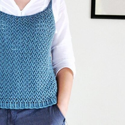 The textured stitch pattern is very elastic. It gently stretches at the bust and hips, while following your curves at the waist, giving the top an excellent fit even with no decreases made.
