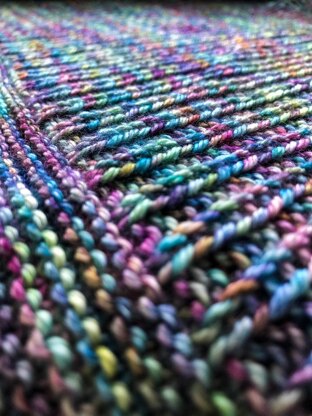 Downtime uses two skeins (800 yd) of fingering weight yarn in the same color. This shawl is knit side-to-side and features a continuous i-cord edge that is worked as you go. The texture alternates between luxuriously squishy slipped stitch rib and garter stitch, so just when you tire of one stitch you get to switch it up and prevent boredom.
