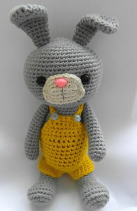 This adorable bunny will be equally good as a child’s best cuddly friend and as an Easter decoration for your house. Made with worsted weight yarn he’s 10”/25cm with the ears (sitting). Gauge: Bunny: sc and 3,5mm hook –24sc in 4”/10cm Overalls: sc and 4mm hook – 18sc in 4”/10cm