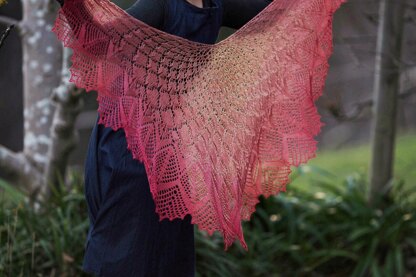 The lace is designed to be easier than it looks, and to experiment with stitch bias, so it does fun things with shiny yarn. It suits lace to fingering weight, and has some flexibility as to yardage. The pattern is written as approx 3/5 of a circle, however it can be adapted to alter the number wedges and use more or less yarn.