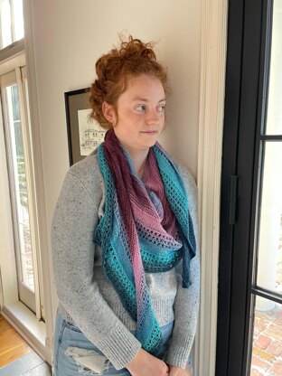 This shawl starts with garter stitch and then shifts to garter ridges, ridged eyelets, ridged lace, and then reverses the transition back to garter stitch. Each section is divided by 8 rows of stockinette stitch.
