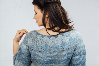 Inspired by tales of dragons, the shaping and colour changes of the yarn in this entrelac yoke are a nod to “dragonscale” armour!