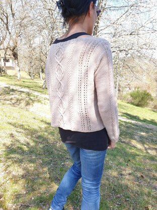 The sweater is worked from top down. You will start with the ribbed collar in round, then shape the shoulders of the back flat in short row; work the back flat to armhole. You will then go to the front and work as back. The body is knitted in round to the end. The sleeves are worked in the round.